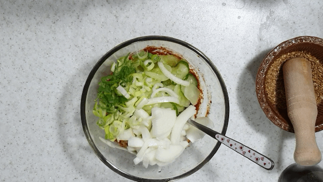 ⑥ 미리 섞어 숙성시킨 양념장에 물기를 짜 고들 해진 오이와 양파, 다진 대파, 쫑쫑 썬 홍고추를 넣고 잘 버무려 줍니다. 더 맛있어져라~ 더 아삭해져라~ 마법주문 잊지 않고 추가합니다. 빻아서 더 고소~~ 해진 통깨 1큰술과 참기름 1/2큰술을 넣어주면 백종원 오이무침 완성입니다.