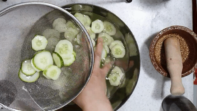 ⑤ 15분 뒤 오이를 접어봐서 부러지지 않고 잘 휘어지면 GOOD!! 잘 절어진 것입니다. 차가운 물에 헹구어 체에 밭친 후 면포나, 저처럼 육수 주머니를 이용해 물기를 꼬~~ 옥 짜 줍니다. 물기를 최대한 짜 주는 것이 아삭아삭하면서 완성 후에도 물기가 생기지 않는 백종원 오이무침 만드는 방법입니다.