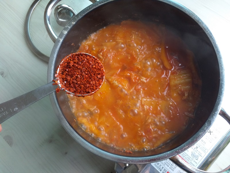 ⑦ 백종원 참치김치찌개에 먹음직한 색감과 얼큰함을 더 해 줄 고춧가루 1큰술 넣어 줍니다.