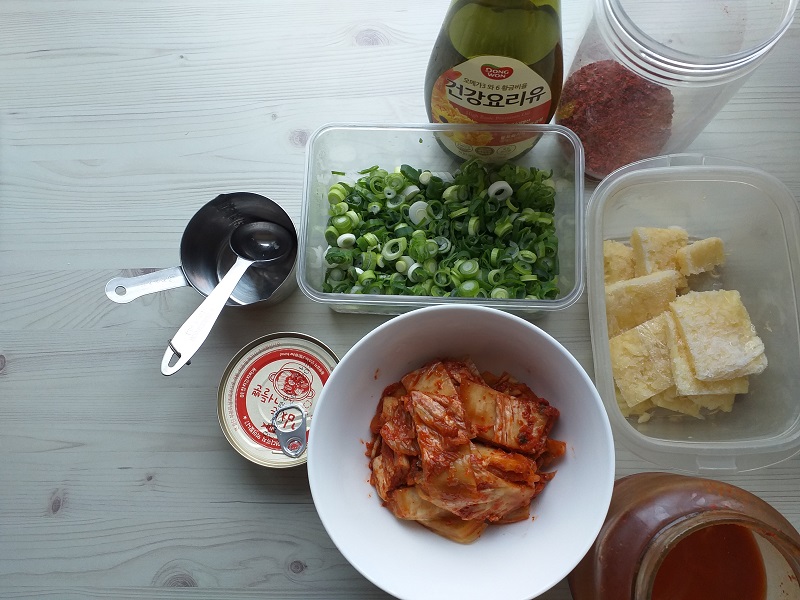 신김치 250g, 참치캔 1개, 대파 5큰술, 청양고추 1~2개, (취향껏) 마늘 1큰술, 김치 국물 100ml, 고춧가루, 국간장 (생략 가능)