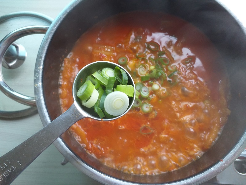 ⑧ 송송 썬 대파를 넣어 줍니다. 청양고추가 있고 얼큰, 칼칼을 추가해주고 싶은 이웃님들은 이때 같이 넣어 줍니다.