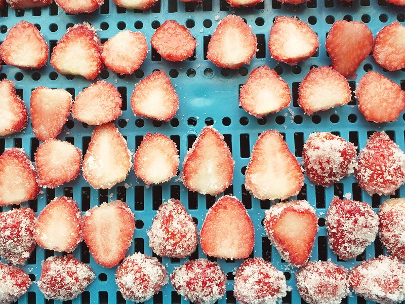 ② 딸기 꼭지를 자른 후 두께 ㅇ. 5cm ~ 1cm 정도로 썰어 줍니다. 건조 과정에서 크기가 1/2~1/3로 줄어들기 때문에 너무 얇지 않게 썰어 줍니다. 저는 쫀득하게 씹히는 식감을 좋아해 두툼하게 썰어 줍니다. 두툼하게 썰어 줄수록 건조시간이 길어지는 건 감안해야 합니다.