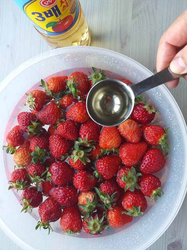 ① 혹시 모를 미세먼지와 잔류 농약 제거를 위해 식초 1 큰술을 놓고 5분 정도 담가 줍니다. 5분 후 흐르는 물에 딸기가 다치지 않게 살살~ 헹궈 채반에 받쳐 물기를 뺍니다.