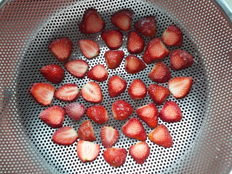 ⑤ 양이 훅 줄어든 딸기 정과를 한 소쿠리로 모아 줍니다.