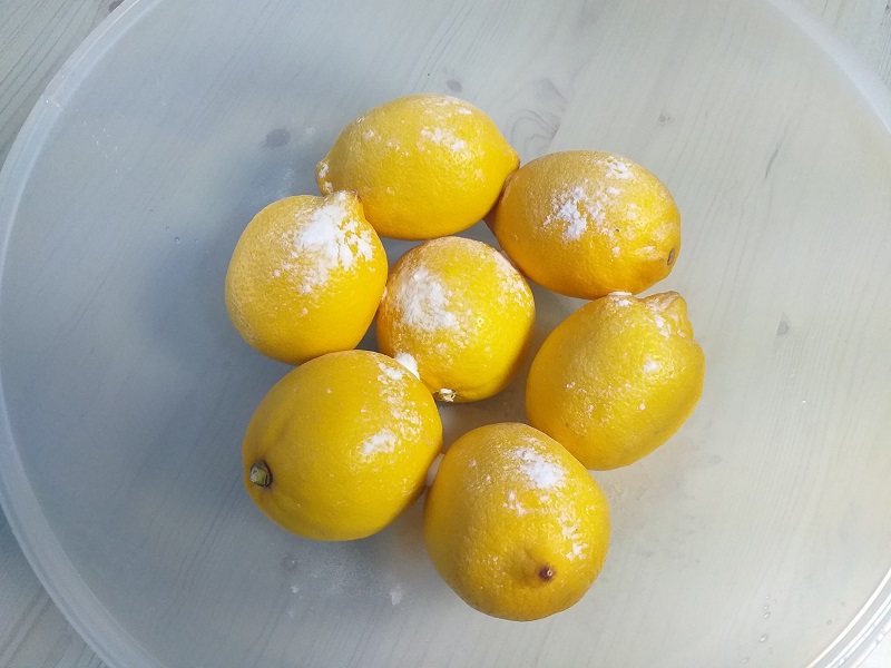 ① 레몬에 베이킹소다를 뿌리고 그 위에 식초를 뿌려 주면, 베이킹소다와 식초가 만나 부글부글 기포가 생기며 세척에 도움이 됩니다. 1차로 씻어준 레몬에 굵은소금을 넣고 문질러 줍니다. 장갑을 끼지 않고 작업 시 손에게 사과하게 되므로 반드시 손 보호를 위해 장갑을 착용합니다.