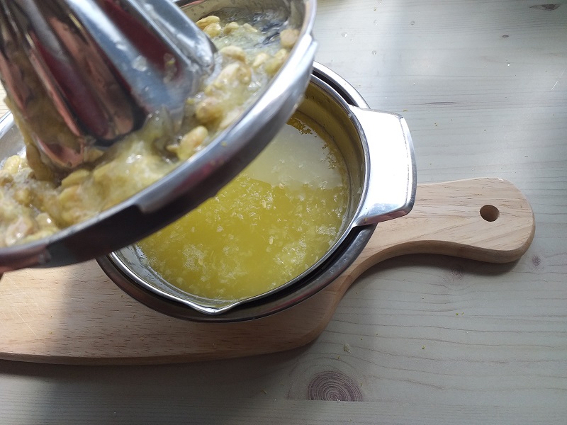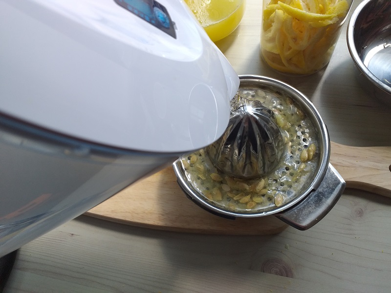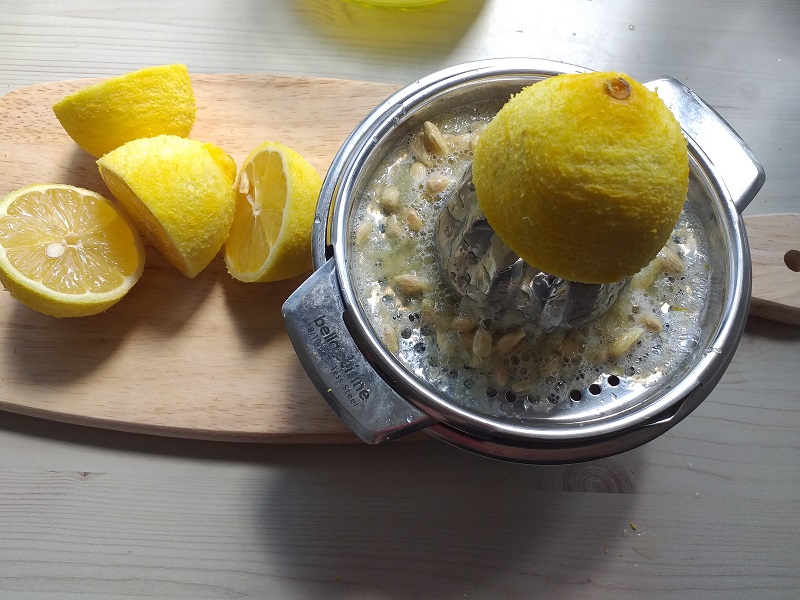 겉껍질을 벗긴 레몬을 반으로 자릅니다. 착즙기에 꾹~ 눌러 짜 줍니다. 끝입니다.