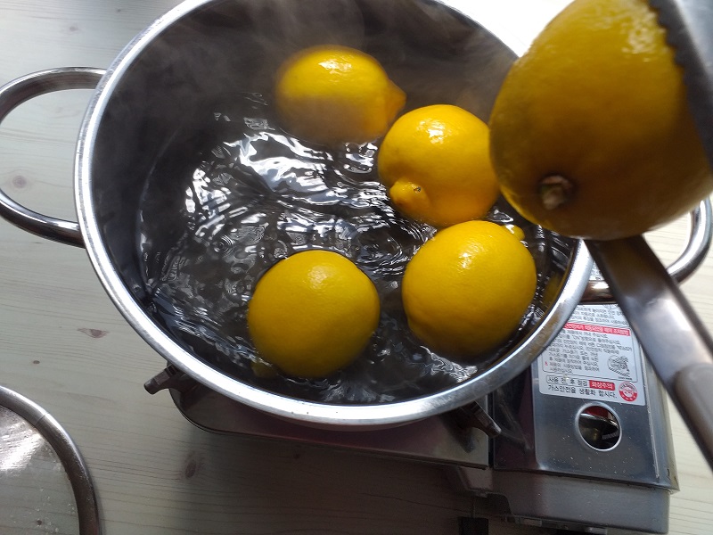 끓는 물에 살짝 데친 레몬은 바로 차가운 물에 입수시켜 식혀줍니다.