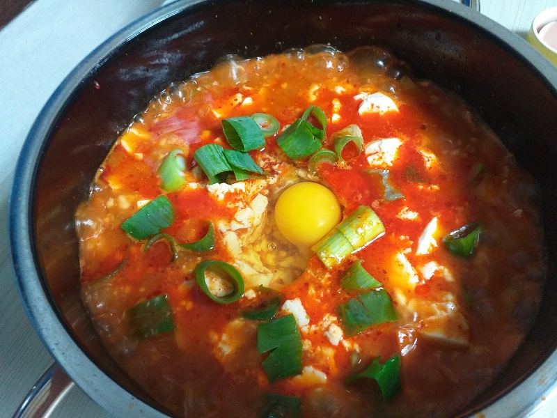 ⑦ 마지막으로 순두부 끓이는 법 화룡정점 계란 한 개를 얌전히 깨뜨러 넣으면 완성입니다.