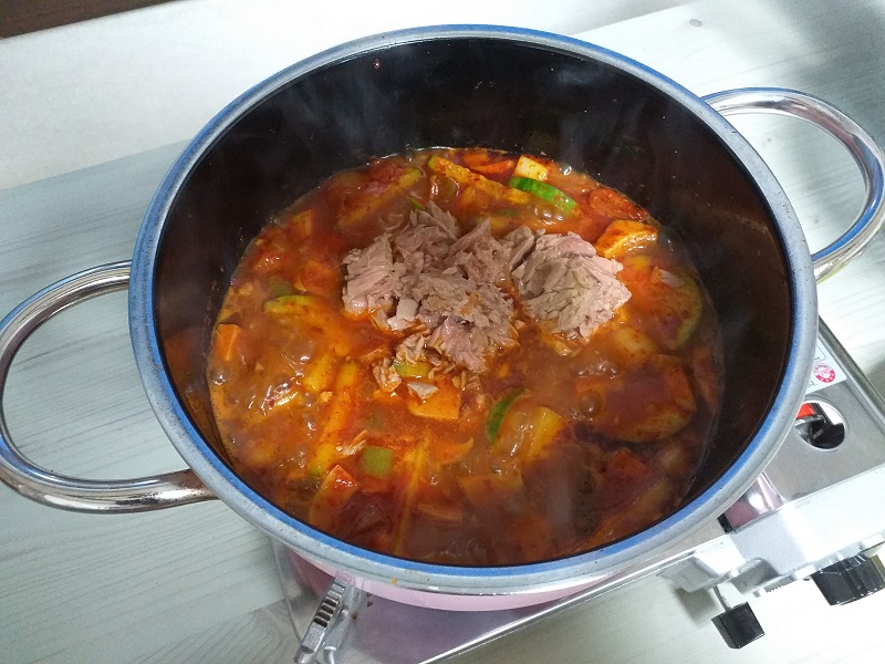 순두부찌개 하면 제일 먼저 떠오르는 게 바지락 순두부찌개이지요. 네 맞습니다. 바지락 넣은 순두부찌개 물론 맛있습니다. 하지만 집에 있는 재료인 참치캔을 이용해 끓인 참치 순두부찌개 또한 전혀 안 꿀리지 않습니다.