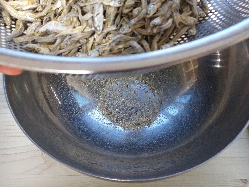 멸치 150g을 채반에 담아 살살 흔들어 부스러기를 제거합니다.