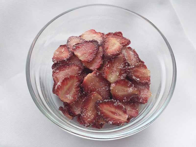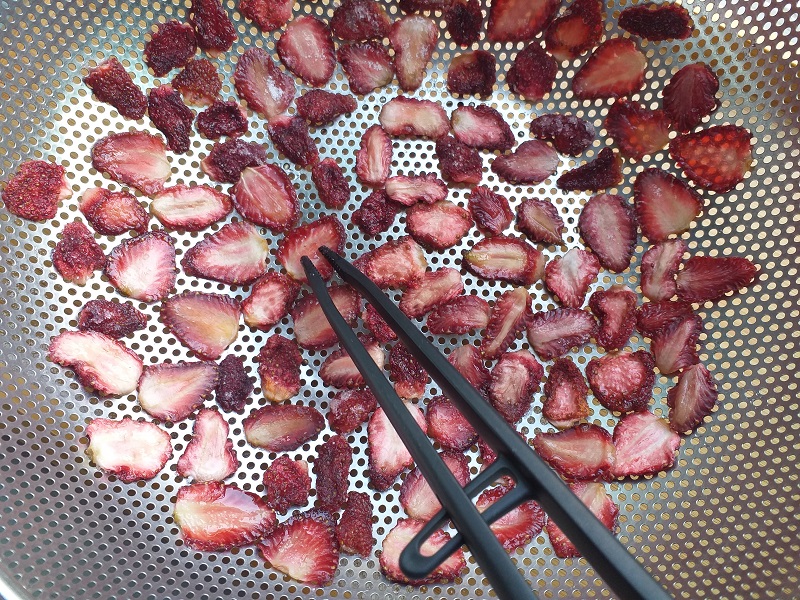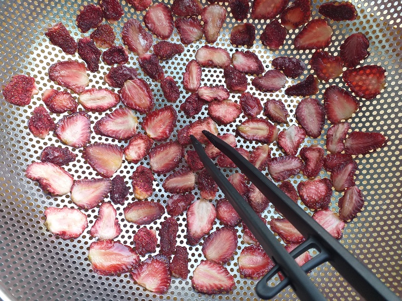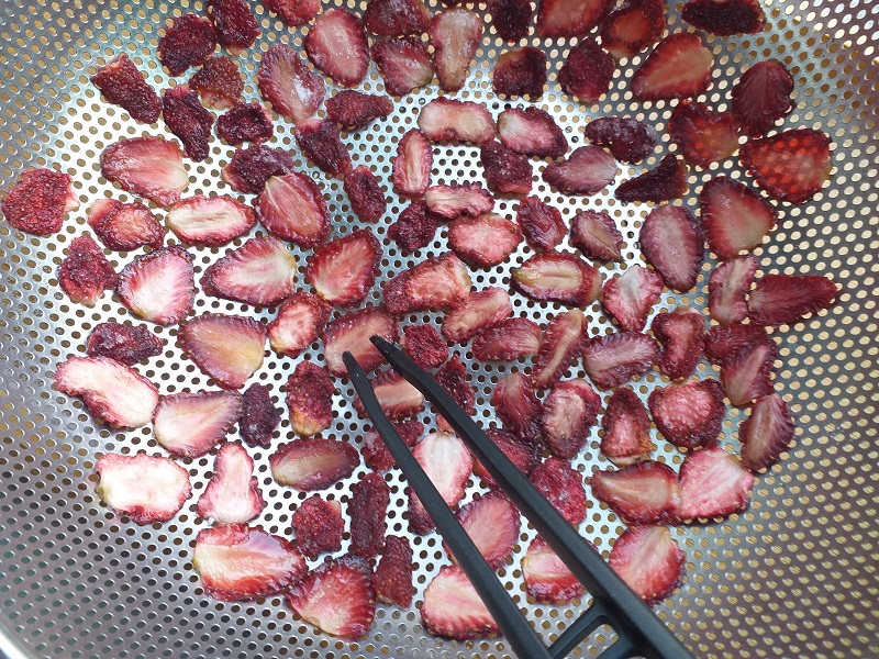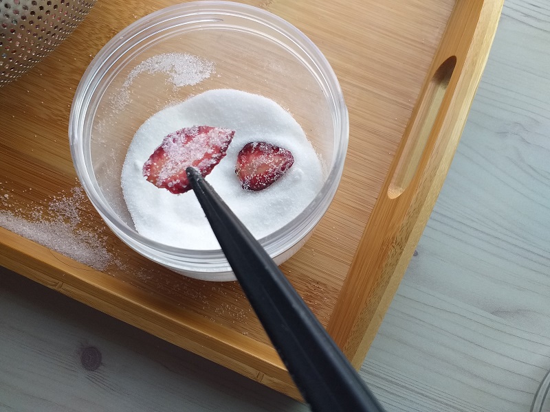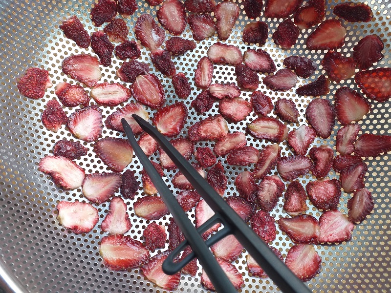 집게로 딸기 양 표면을 툭툭 쳐서 말림에 정도를 체크합니다. 드디어 완성입니다.