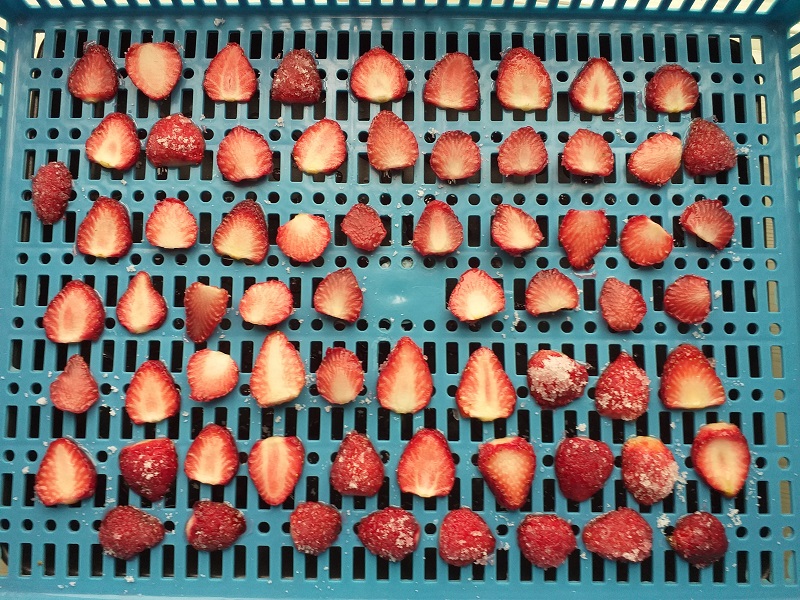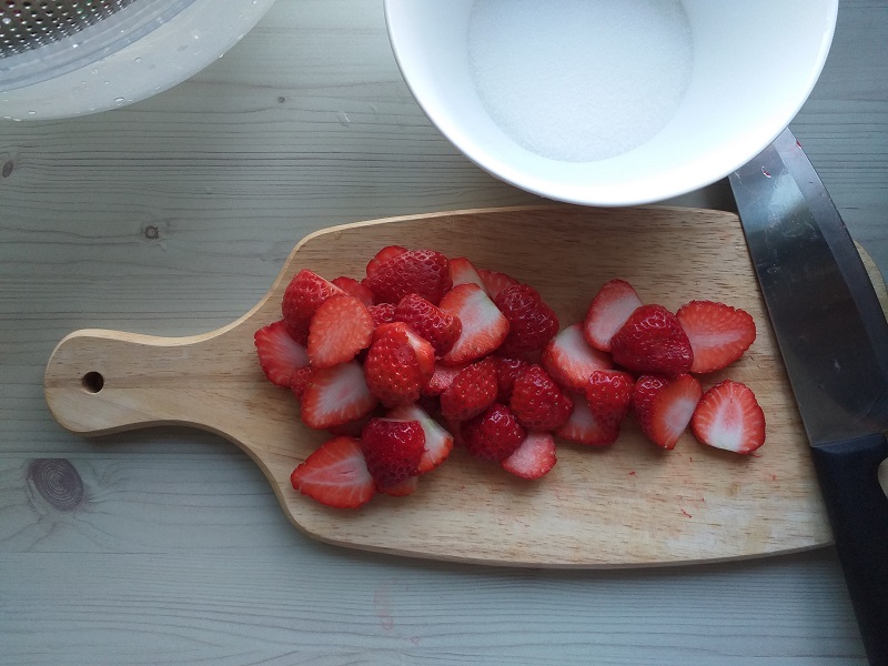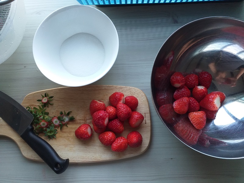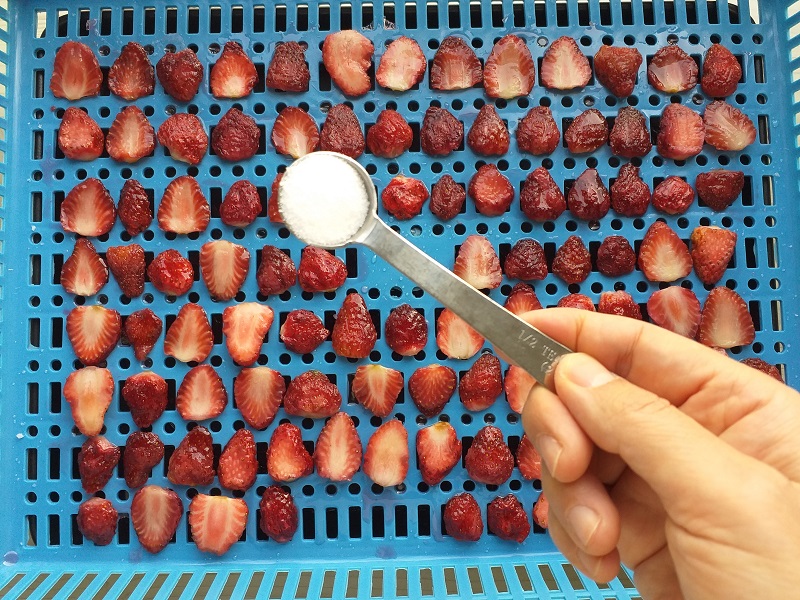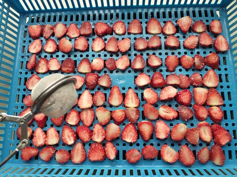 ② 딸기 꼭지를 자른 후 두께 ㅇ. 5cm ~ 1cm 정도로 썰어 줍니다. 건조 과정에서 크기가 1/2~1/3로 줄어들기 때문에 너무 얇지 않게 썰어 줍니다. 저는 쫀득하게 씹히는 식감을 좋아해 두툼하게 썰어 줍니다. 두툼하게 썰어 줄수록 건조시간이 길어지는 건 감안해야 합니다.