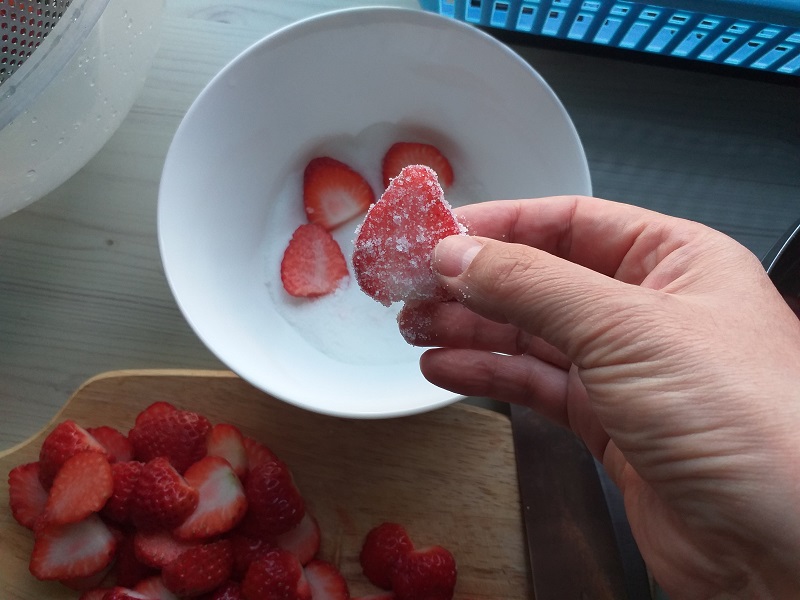 ③ 흰 설탕을 듬~뿍 듬뿍 묻힙니다. 다른 설탕도 가능하고, 꿀도 가능하다고 합니다만, 저는 정과에 색감을 위해 흰 설탕을 사용합니다. 수분이 많은 딸기에 물을 빼 주기 위한 과정이므로 설탕을 듬뿍듬뿍 묻혀 주는게 포인트입니다.