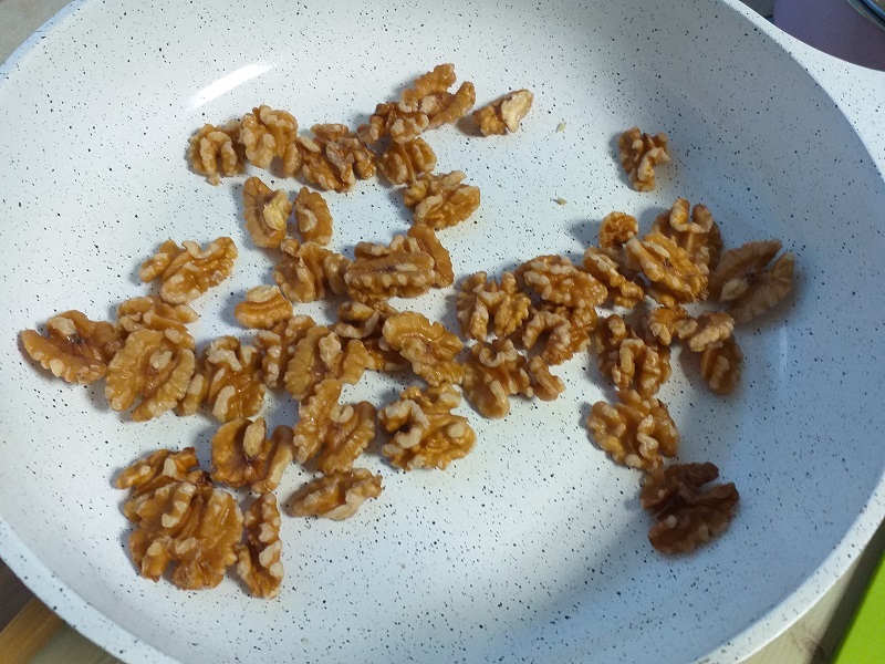 데친 호두는 흐르는 물에 3~4번 깨끗이 헹군 후 달군 프라이팬에 기름 없이 달달 볶아 주면 더 고소하고 건강한 멸치볶음 황금 레시피 핵심 하나입니다.