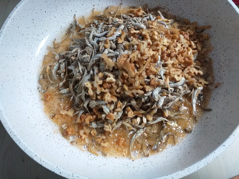 바글바글 양념이 끓어오르면 한번 볶아 놓은 멸치, 아몬드, 호두를 넣고 쉐킷 쉐킷~ 볶아 줍니다.