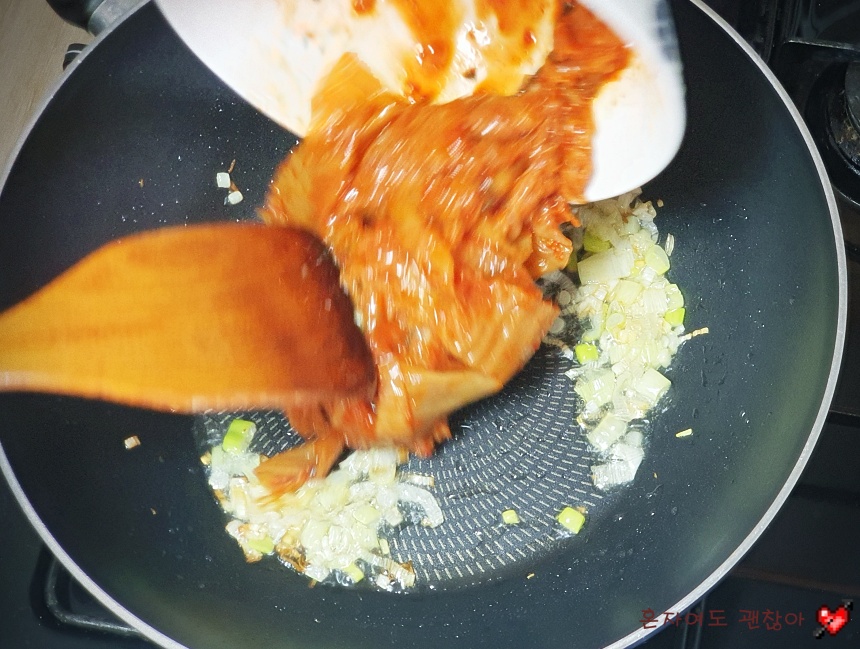 ④ 대파가 노릇노릇하게 잘 볶아지며 대파향이 물씬 풍기면 설탕에 버무려 놓은 신김치를 넣어 줍니다. 신김치가 잘 볶아지면 다음 선수 양파와 고춧가루를 넣고 쉐킷 쉐킷 볶아 줍니다.