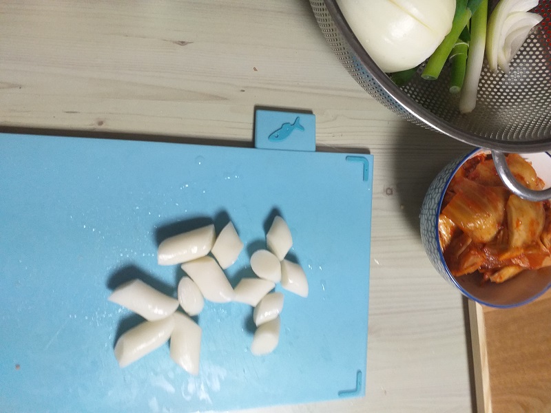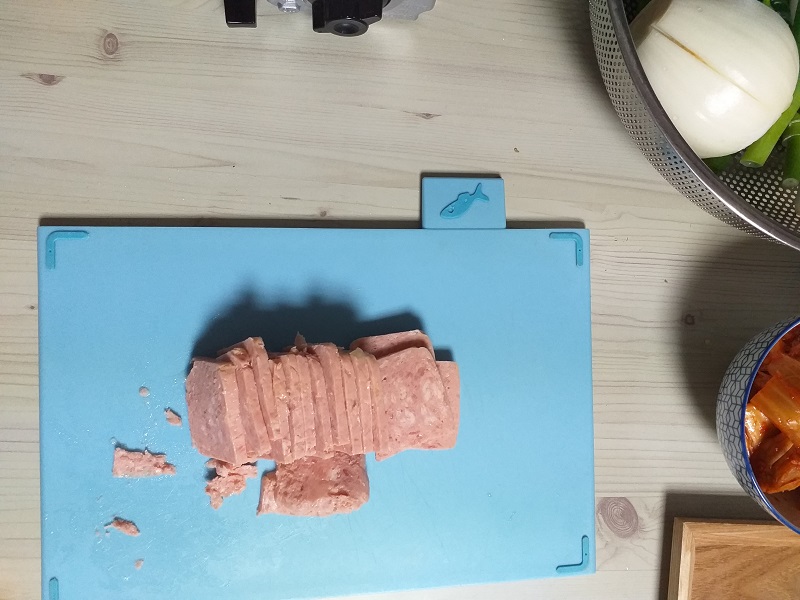 ① 스팸 1 개를 너무 두꺼우면 국물이 스며들지 않고 찌개와 겉돌게 되니 두껍지 않게 썰어 줍니다. 소시지는 한입 크기로 어슷썰기 합니다. 본인이 좋아하는 스타일로다가 썰어 주도록 합니다. 떡볶이 떡을 한입 크기로 썰어 준 떡사리도 준비합니다. 떡사리를 참 좋아하지만 너무 많이 넣으면 국물 맛이 텁텁해지고, 라면사리도 넣어 줄거라 참습니다.
