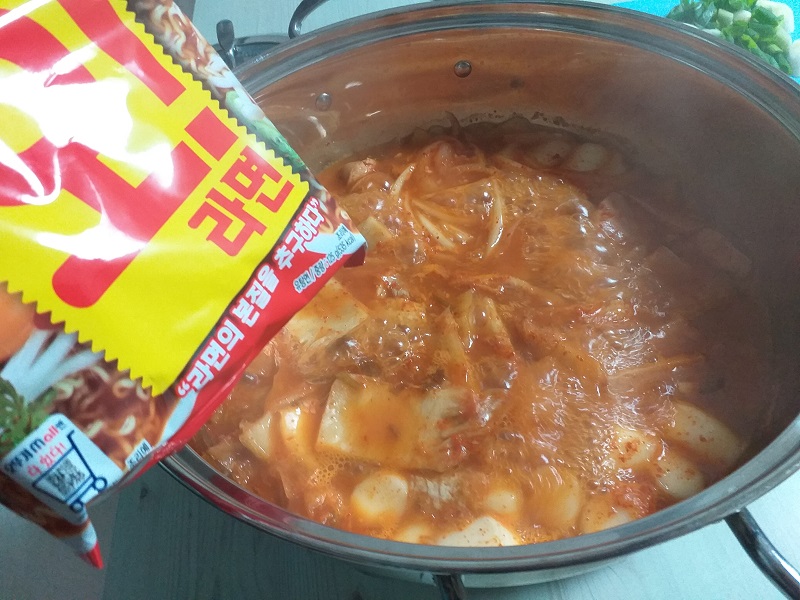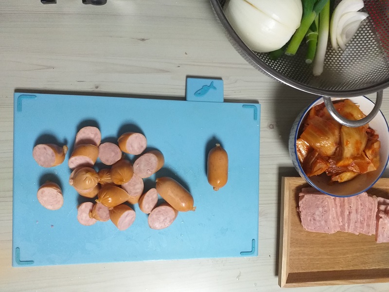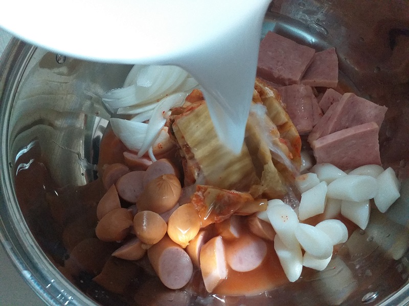 스팸 1개, 소세지 10~12개, 김치 1 공기, 양파 1/2개, 대파 1대, 청양고추 2개, 떡사리, 라면사리, 쌀뜨물