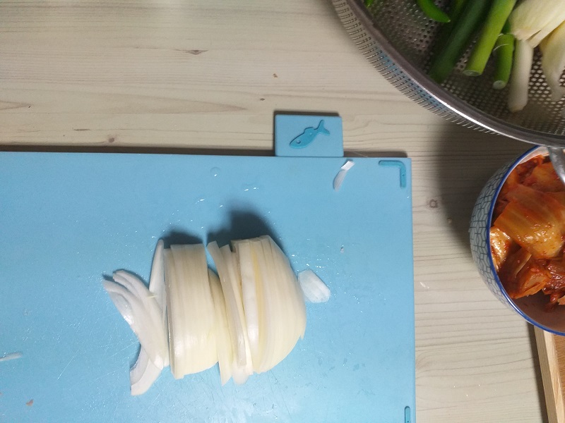 ② 양파 1/2개를 두툼하게 썰어 줍니다. 저는 잠깐 생각이 삼천포로 빠져 볶음용으로 얇게 썹니다. 반성합니다.