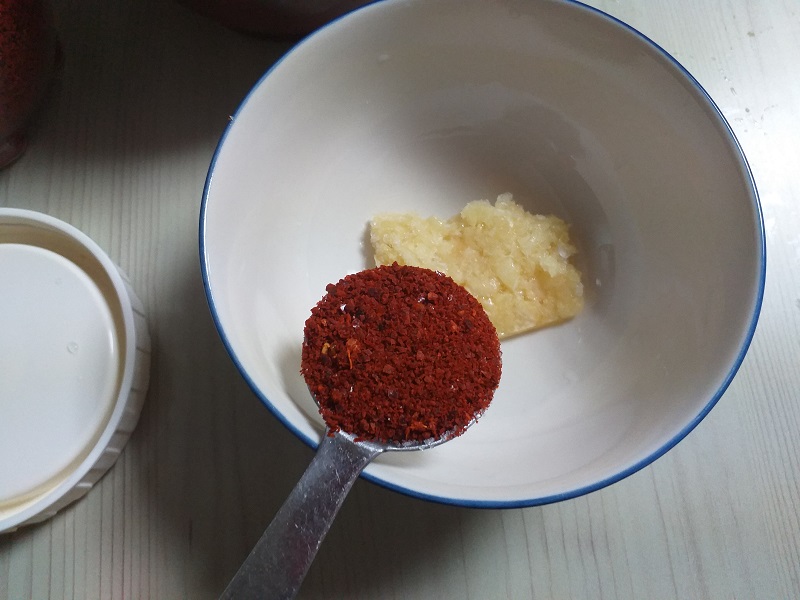 다진 마늘 1 큰술, 고춧가루 1.5 큰술, 고추장 1 큰술, 국간장 1 큰술, 생강술 1큰술, 후추 약간을 넣고 섞어 줍니다.