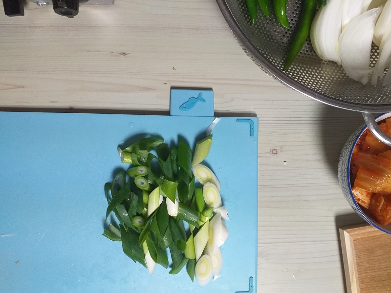 시원한 국물 담당 대파도 큼직하게, 얼큰 칼칼함 담당 청양고추도 큼직하게 어슷 썹니다.