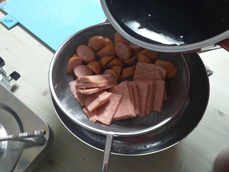 ④ 햄과 소시지를 채반에 받치고, 끓는 물을 부어 몸에 좋지 않은 기름, 불순물을 빼줍니다. 더 담백한 부대찌개 만드는 법이 됩니다.