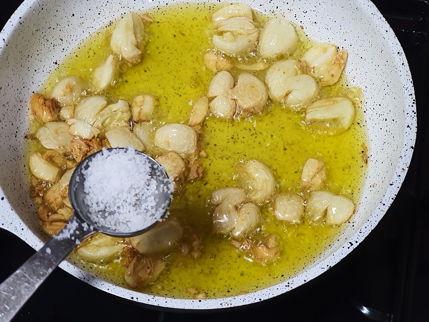 ③ 후라이팬에 올리브유 한 컵을 붓고 마늘을 넣고 약불에서 끓이기 시작합니다. 최대한 마늘을 향을 뽑아내 주는 게 백종원 감바스에 제일 중요한 뽀인트이므로 마늘은 절대 센 불에서 튀기듯 익히지 않고 약불에서 천천히 익혀 줍니다. 마늘이 노릇노릇 잘 구워지면 마늘 1/5큰술로 간을 더 해주고, 매운맛을 더해줄 페페론치노 5~6개를 추가합니다.