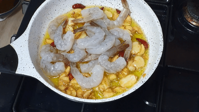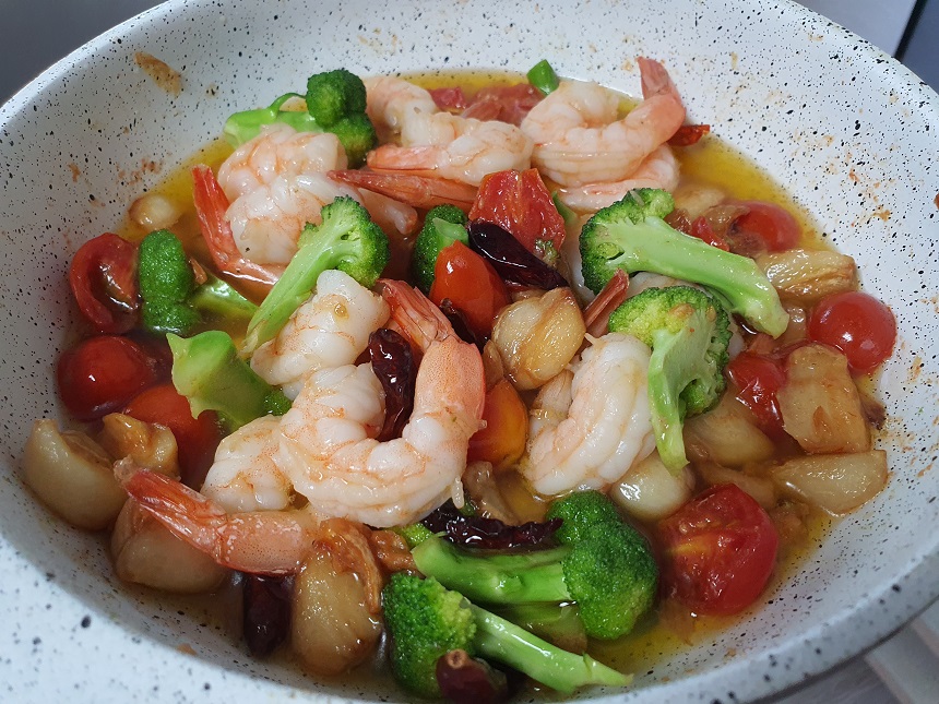 ④ 준비한 야채와 새우를 넣고, 새우 색이 바뀔 때까지만 익혀 주기만 하면 감바스 만들기 완성입니다. 참 쉽지유~~~ㅎ