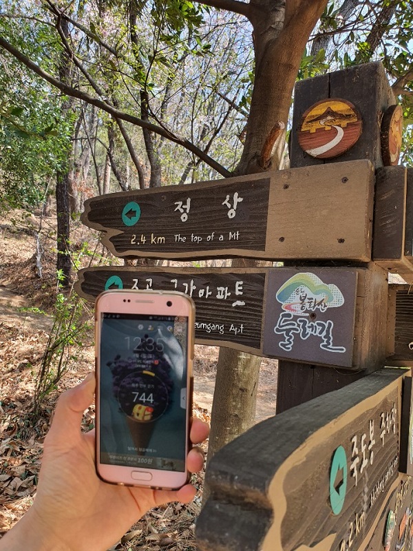 정상까지 2.4km입니다. 744 걸음에서 등산 시작~~ 절대 서두르지 않습니다. 느리게 걸으며 나무와 눈 맞추고, 간혹 보이는 새와 인사하며 등산 다이어트를 즐깁니다. 사람이 지나가지 않을 때는 마스크를 벗고, 최대한 깊게 피톤치트 가득한 숲 속 공기를 들이마셔 봅니다. 청량한 나무 내음이 내 몸과 마음을 정화시킵니다.