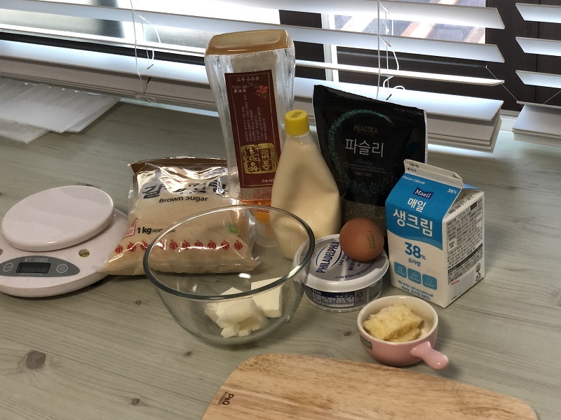 큰 사이즈 모닝빵 3~4개, 크림치즈 150g, 설탕 40g, 버터 100g, 생크림 20g(우유 대체 가능), 꿀 40g(설탕 대체 가능), 마요네즈 2큰술, 마늘 50g, 파슬리 3큰술, 계란 1개