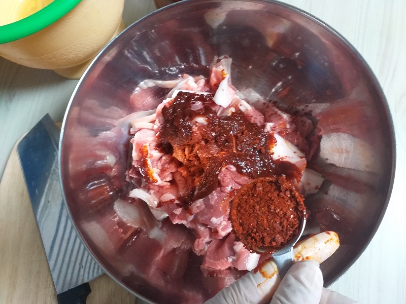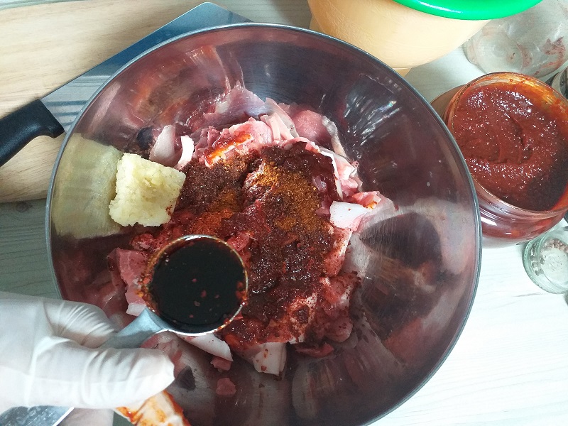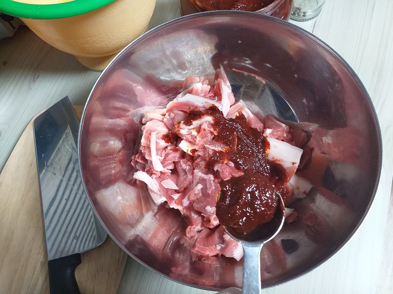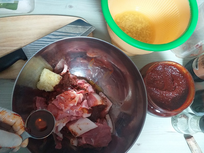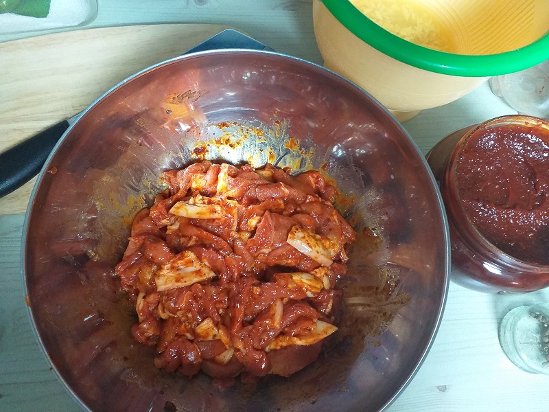 고기 양념 - 고추장 2 큰술, 고춧가루 3 큰술, 진간장 1 큰술, 올리고당 2 큰술, 매실발효액 1 큰술, 생강술 1 큰술,