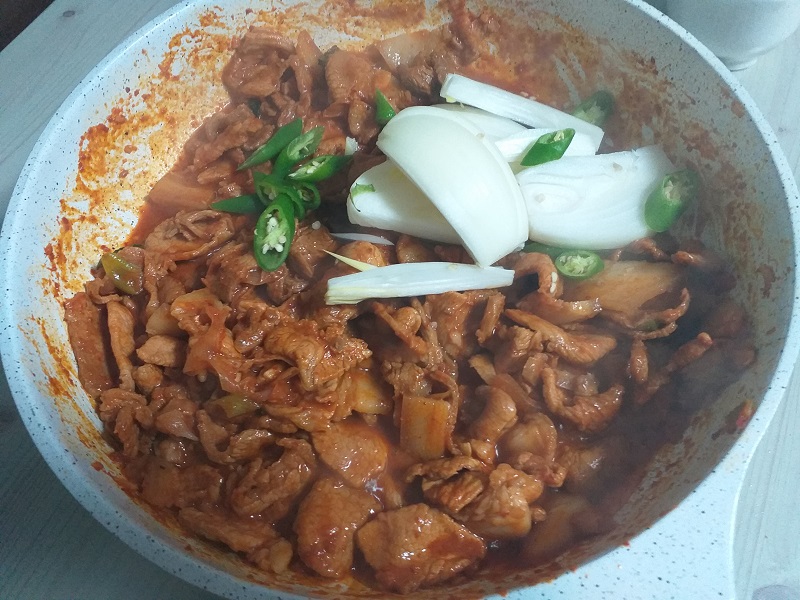 잘 볶아진 돼지고기 앞다리살에 양파와 청양고추를 볶아 주다 양파가 익으면 불을 끄고, 통깨를 뿌려주면 완성입니다.
