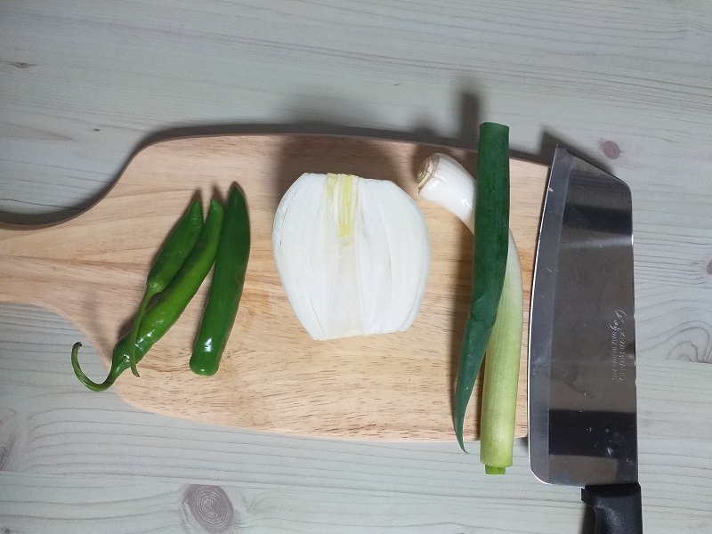 양념에 재운 앞다리살이 더 맛있어지는 동안 양파 1/2개, 청양고추 2개 같은 3개, 대파 1/2개를 썰어 줍니다.