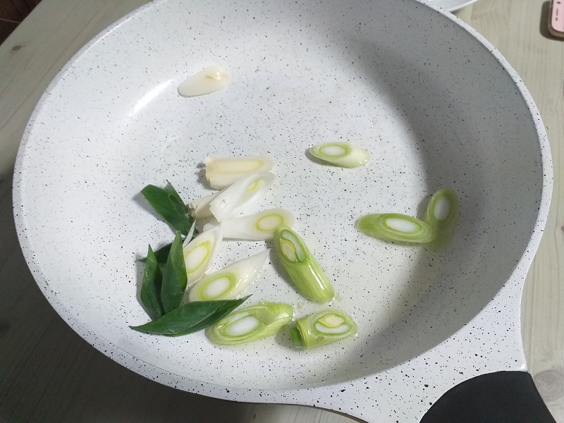프라이팬에 식용유 2 큰술을 두르고, 어슷 썰은 대파를 넣고 파 기름을 냅니다. 파 향이 올라오면 잘 숙성된 앞다리살을 넣고 맛나게 볶아줍니다. 더 맛있어져라~ 더더 맛있어져라~ 마법 주문도 잊지 않고 넣습니다.