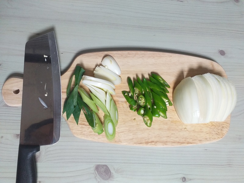 양파는 1cm 정도 두툼하게 썰고, 청양고추와 대추는 어슷썰기 합니다.