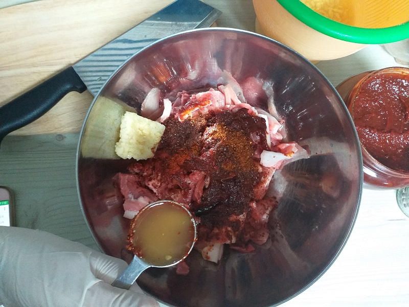 고기 양념 - 고추장 2 큰술, 고춧가루 3 큰술, 진간장 1 큰술, 올리고당 2 큰술, 매실발효액 1 큰술, 생강술 1 큰술,