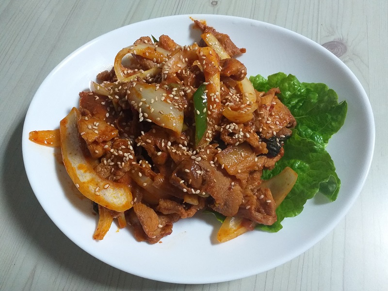 잘 볶아진 돼지고기 앞다리살에 양파와 청양고추를 볶아 주다 양파가 익으면 불을 끄고, 통깨를 뿌려주면 완성입니다.