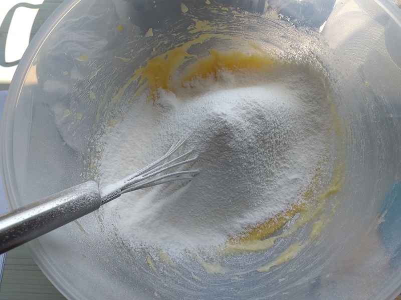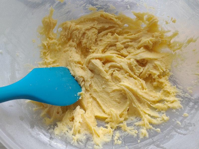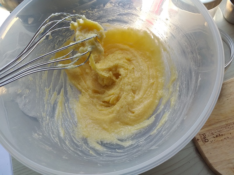 ④ 설탕과 잘 섞은 버터에 계란 55g, 바닐라 익스트랙 3g을 넣고 완전히 섞일 정도로만 가볍게 섞습니다.