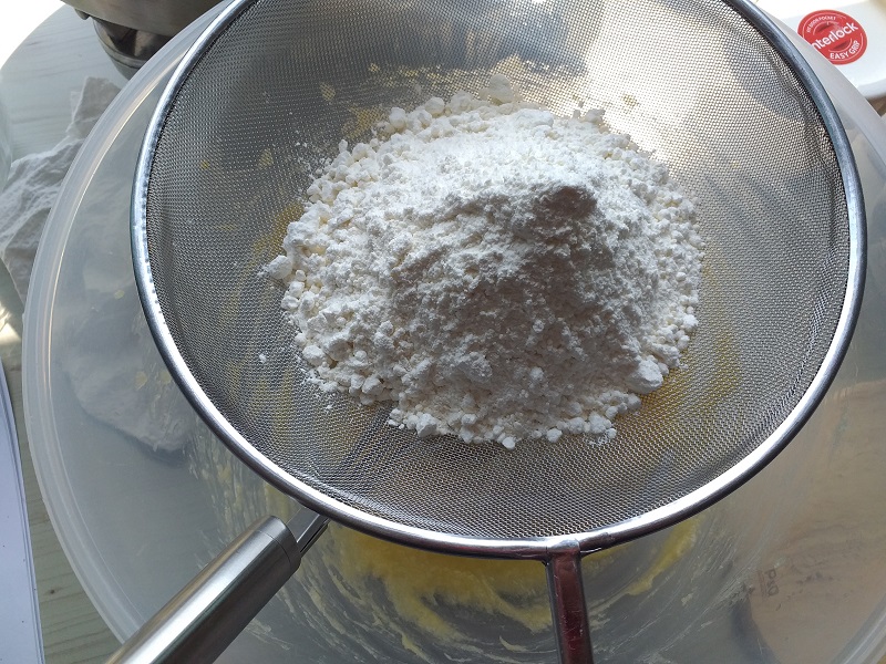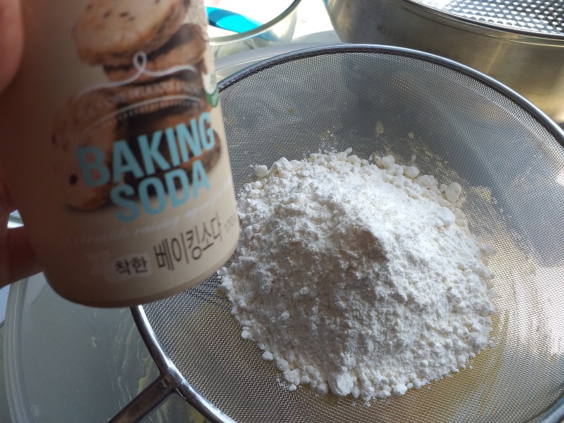 ⑤ 중력분 170g, 베이킹소다 2g을 채 쳐 넣고, 날가루가 보이지 않을 때까지만 가볍게 섞어 줍니다.