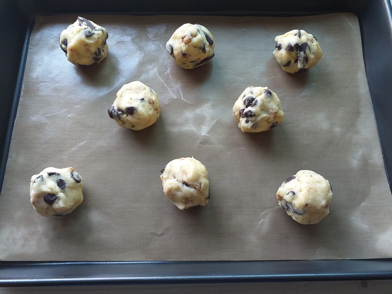 냉장고에서 1시간 이상 휴지 시킨 쿠키 반죽을 50g씩 분할하니 총 14개 나와 저희 집 가정용 소형 오븐으로 두 번에 나눠 굽습니다. 쿠키가 구워지며 자연스럽게 퍼지므로 오븐 팬에 적당한 간격을 두고 팬닝 하도록 합니다.