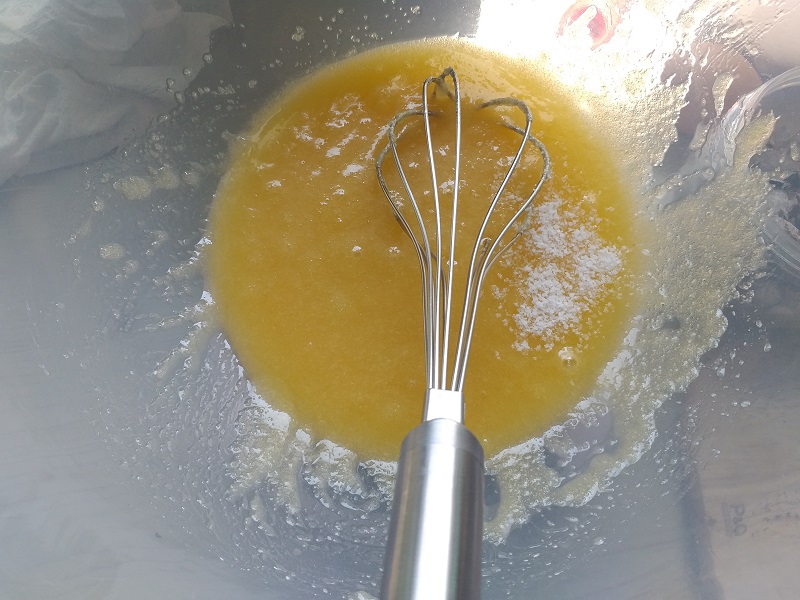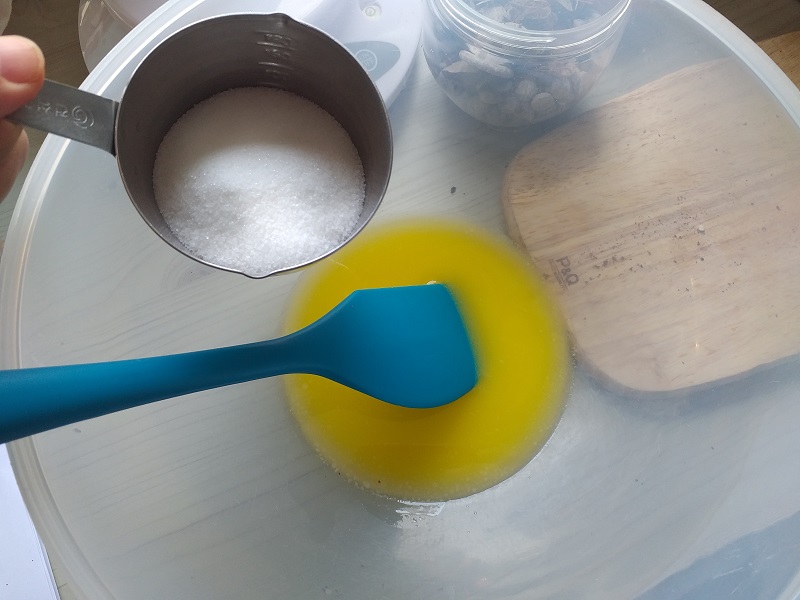 ③ 중탕으로 녹인 버터에 흰 설탕 60g, 황설탕 100g, 소금 2g을 넣고 섞어 줍니다.