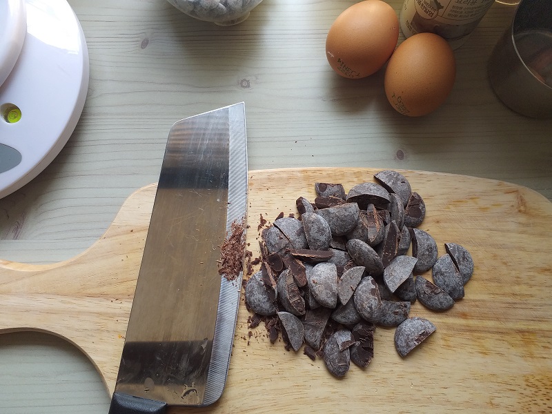 ② 버터가 녹는 동안 다크커버춰는 반으로 이등분하고 호두 또한 너무 크지 않게 썰어 줍니다.