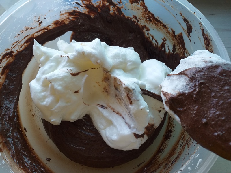 체친 코코아 파우더와 옥수수 전분을 초코 반죽에 섞어 준 후, 머랭 절반에 넣고 머랭이 꺼지지 않게 주의하면 잘 섞어 줍니다. 믹싱볼에 돌려가며, 주걱으로 바깥쪽에서 안쪽으로 걷어 올리듯 섞어 줍니다. 어느 정도 섞어지면 나머지 머랭을 넣고 섞어 줍니다.