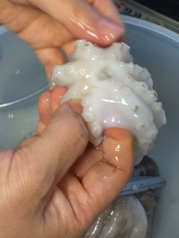 깨끗하고 씻은 주꾸미, 우유 빛깔 속살을 드러내면 자체 발광합니다.