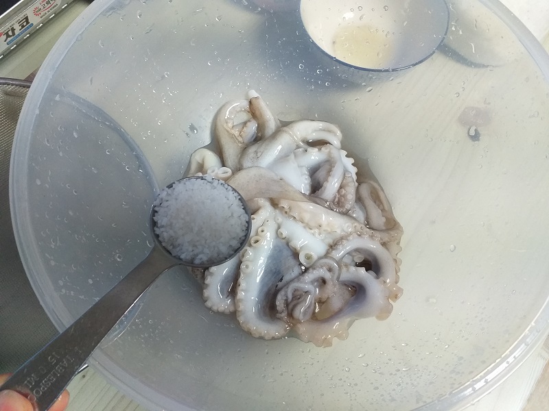 ② 손질이 끝난 주꾸미를 굵은소금 1 큰술, 밀가루 1 큰술을 넣고 조물조물 주물어 빨아 빨판 사이사이 낀 불순물을 제거합니다.