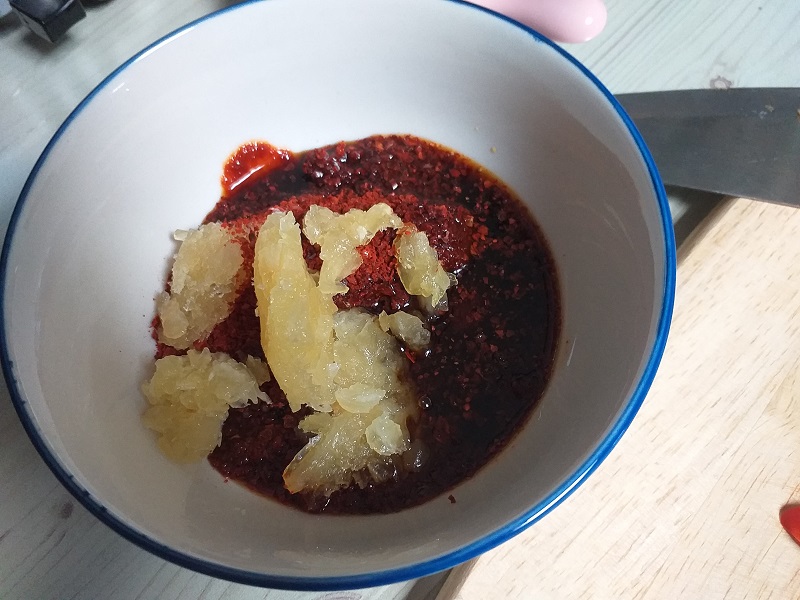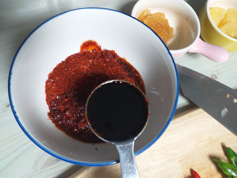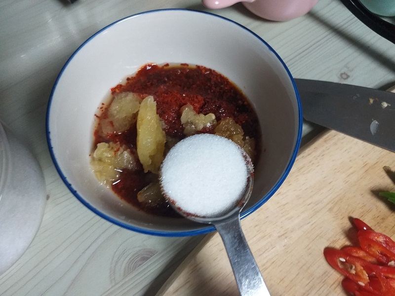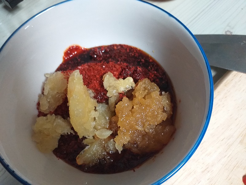 양념장 - 고추장 3 큰술, 고춧가루 3 큰술, 간장 2 큰술, 생강술 1 큰술, 다진 마늘 1.5 큰술, 설탕 1 큰술, 올리고당 1큰술, 배 생강청 1 큰술, 후춧가루