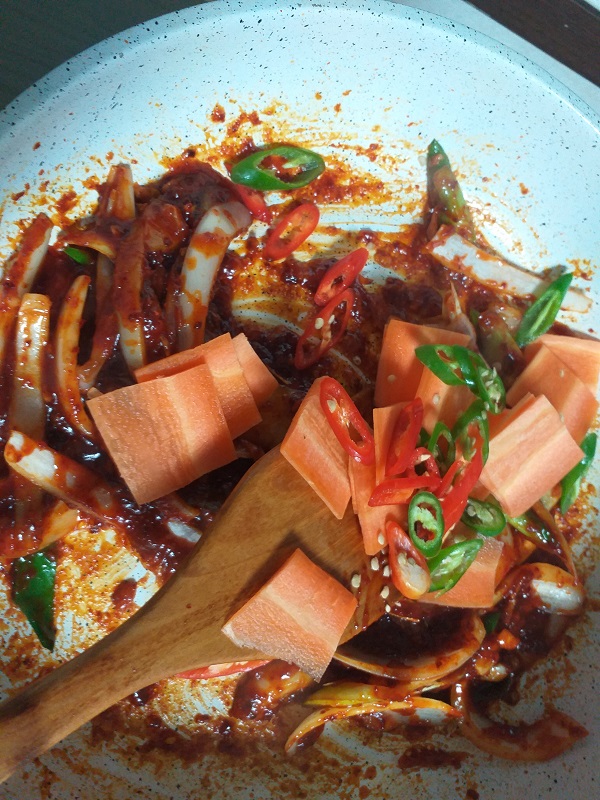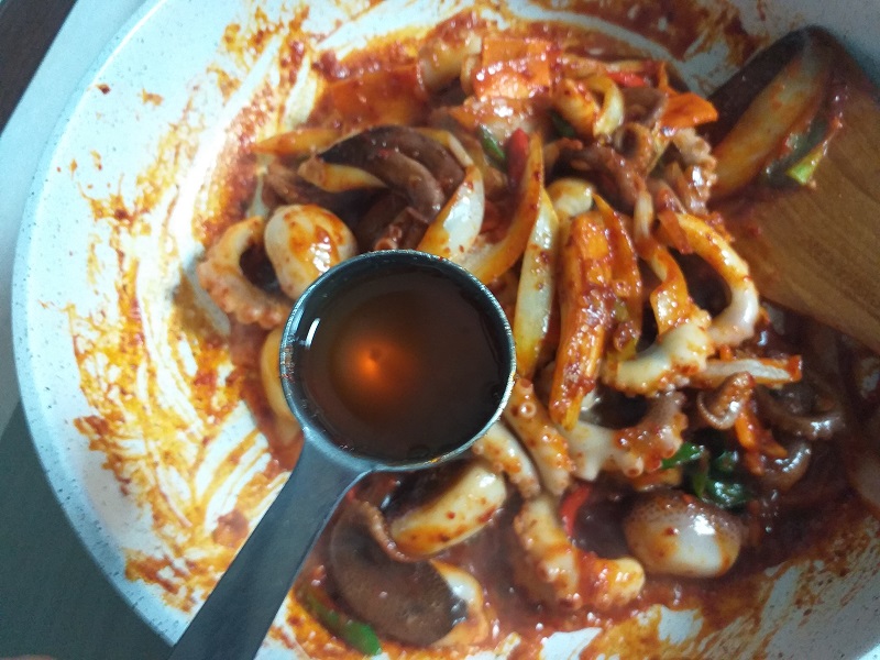 곧 주인공 주꾸미 등장하니 긴장합니다. 심하게 긴장해 사진이 흔들립니다. 주꾸미는 센 불에서 짧게 볶아줘야 물이 생기지 않고 질겨지지 않습니다. 주꾸미 5마리 중에 알 밴 주꾸미는 2마리, 그 두 마리에 알 중 한 알도 지켜내지 못하고 맙니다. 어차피 터져버린 알, 어떻게든 먹기만 하면 된다 스스로 위로하며 마지막 장식은 언제나 참기름 & 통깨입니다.