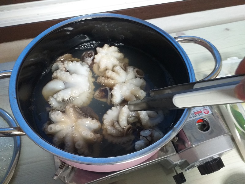 ⑥ 오늘에 주인공 주꾸미를 굵은소금 1/2 큰술, 청주 1 큰술을 넣고 10초 ~ 20초 살큼 데쳐 줍니다.