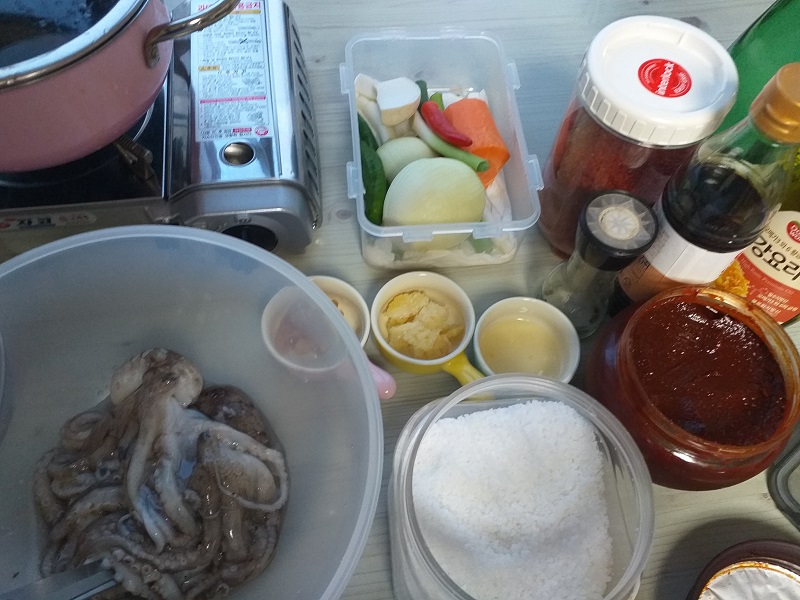 주꾸미 5마리 600g, 양파 1/2개, 당근 1/5개, 대파 1/2개, 청양고추 1개, 홍고추 1개, (청양고추 2개로 대체 가능) 청주 1큰술, 참기름 1 큰술, 식용유 약간, 통깨, 굵은소금, 소면 한 줌 (취양 껏)