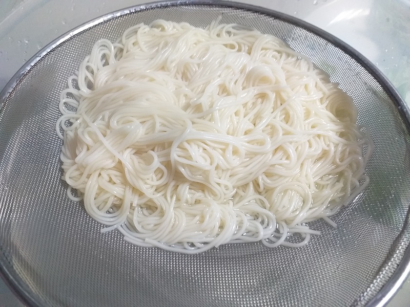 끓는 물에 소면 한 줌을 넣고 삶아 주다가 끓어오르면 차가운 생수 한 컵을 추가하는 과정을 2~3번 해 준 후, 차가운 물에 빨래 빨듯이 빡빡 문질러 빨아 전분기를 제거하고 물기 제거를 위해 소쿠리에 받칩니다.